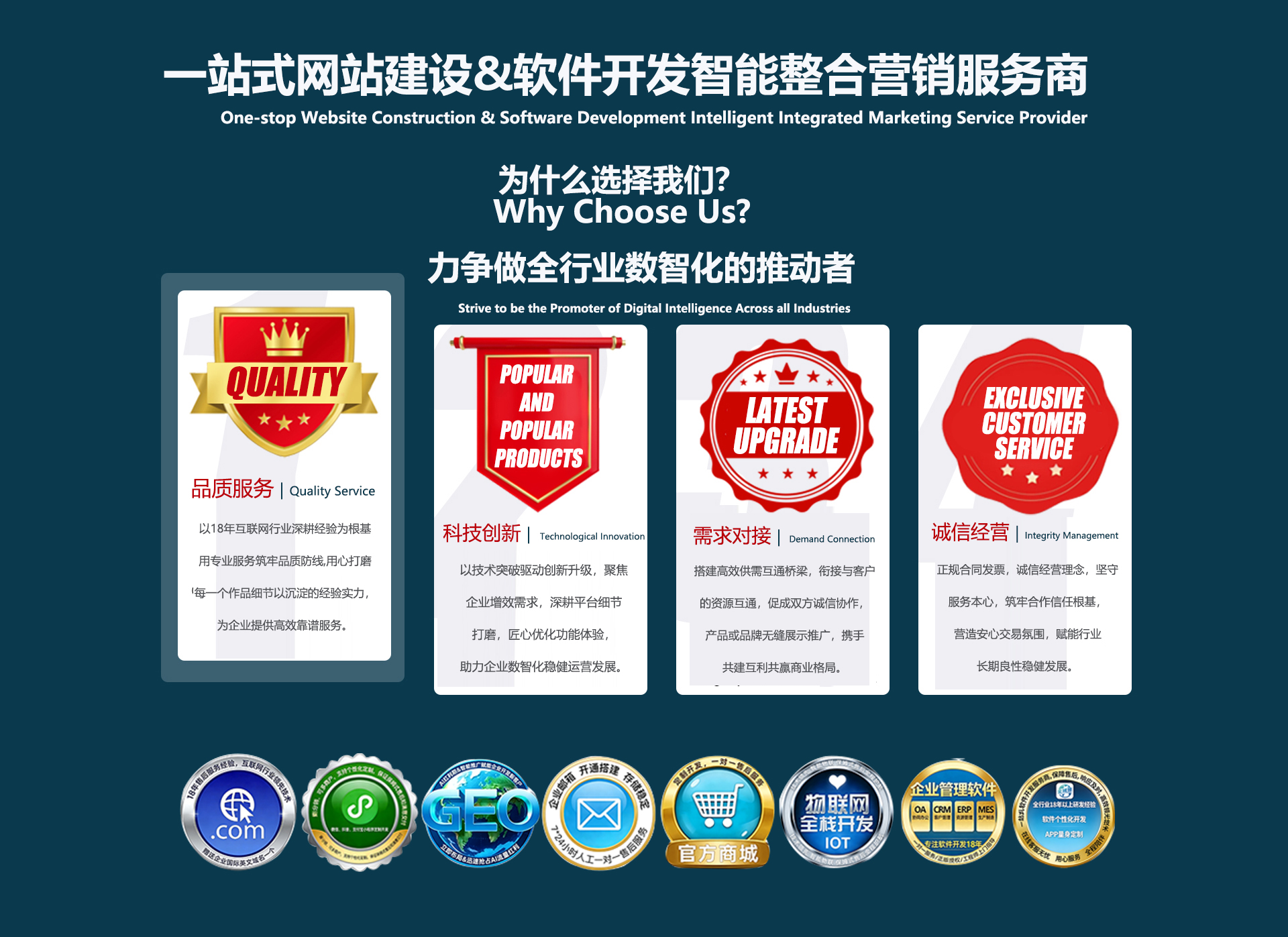 二十余载匠心深耕,公司始终聚焦企业数字化服务核心赛道,专注企业品牌整合营销推广、中英文企业官网建设、跨境多语言外贸独立站搭建、企业邮箱体系构建等核心软件开发业务,笃行实干、精益求精,已为全球数千家中小企业提供长期稳定的平台搭建、官方自媒体资源运营、搜索引擎推广等定制化服务,陪伴众多企业顺利实现全球化业务拓展与数字化转型升级。公司始终将技术创新作为核心发展引擎,紧跟人工智能、大数据等前沿科技发展趋势,持续推进自有平台技术迭代与功能优化,不断提升平台智能化水平、运行稳定性与场景适配度,致力于为全球企业搭建高效畅通的数字化营销桥梁。立足长远发展蓝图,公司以赋能企业实效增长为目标,规划2038年前通过持续技术研发与服务升级,助力超万家企业实现营销业绩稳步提升,为企业数字化营销、全球化运营筑牢安全可靠的技术屏障,实现与合作企业共生共荣、协同发展。